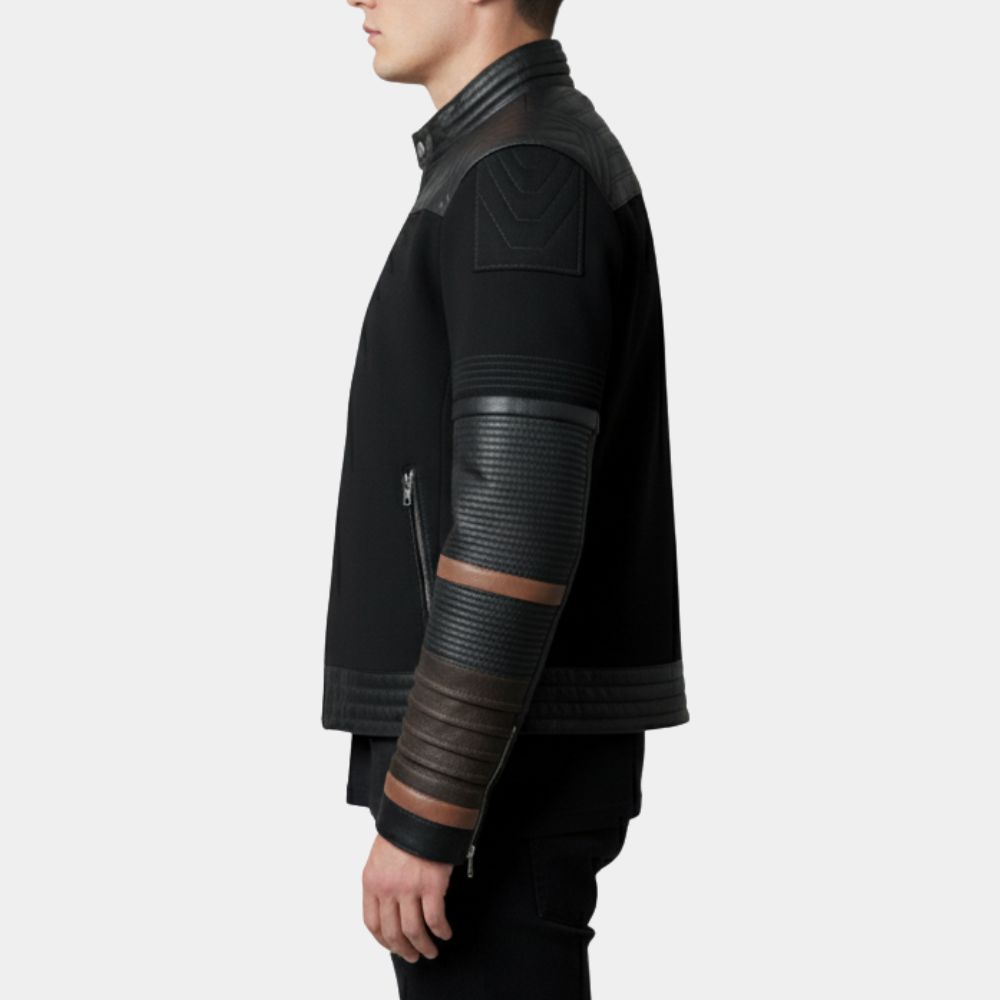 Design-wise, the padded details across the shoulders and arms give the jacket a tactical edge, while the deep black leather brings a grounded, timeless quality. The craftsmanship feels inspired by utilitarian outerwear from military archives — something built to last and protect without sacrificing style. Subtle stitching, a practical zip front, and functional pockets make it ideal for both in-universe missions and real-world adventures.