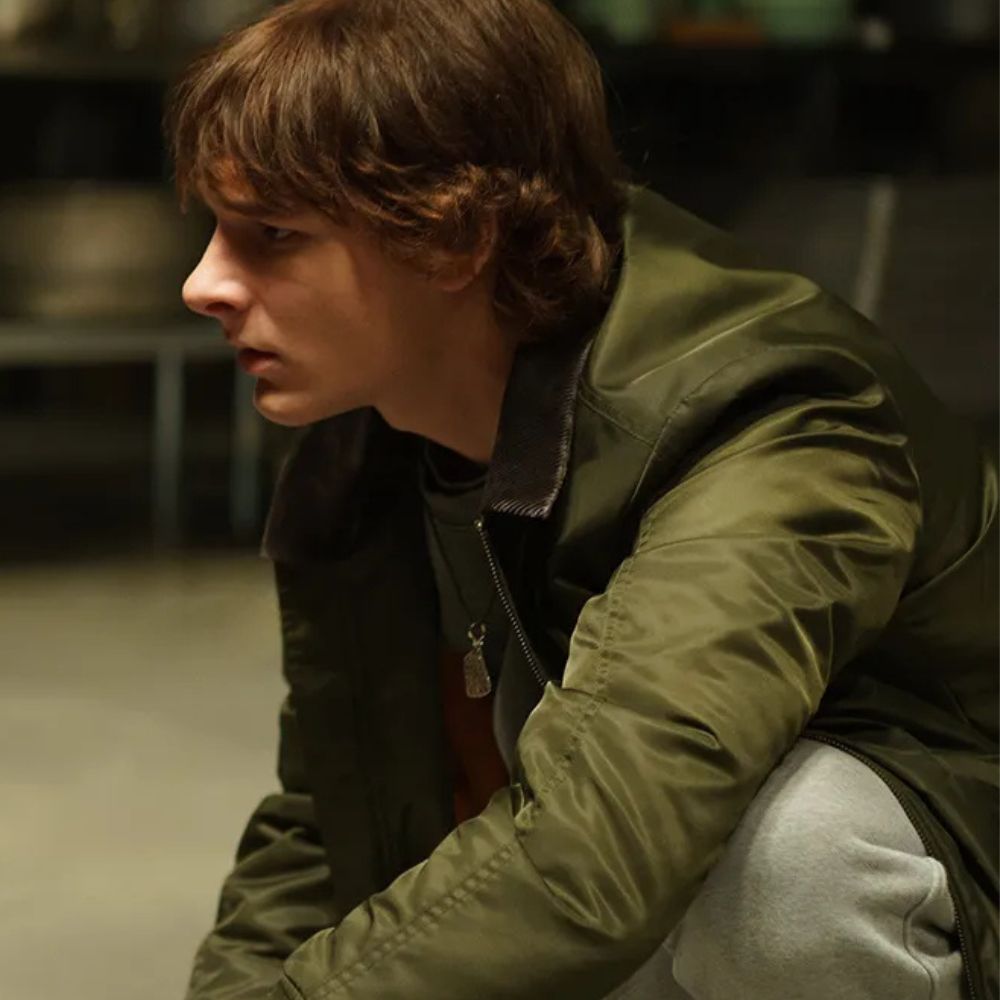 Mason Thames’ look as Finney in The Black Phone 2 keeps that mix of vulnerability and quiet strength that made his character so memorable in the first film, and the green satin bomber jacket fits right into that vibe. It feels like a nod to classic 70s and 80s youth fashion, capturing that coming-of-age energy while still carrying a darker undertone that matches the eerie tension of the story. Finney’s character has always been about survival, courage, and finding light in terrifying places, and this jacket mirrors that—simple, timeless, and subtly defiant, like a layer of confidence he wears against the unknown.