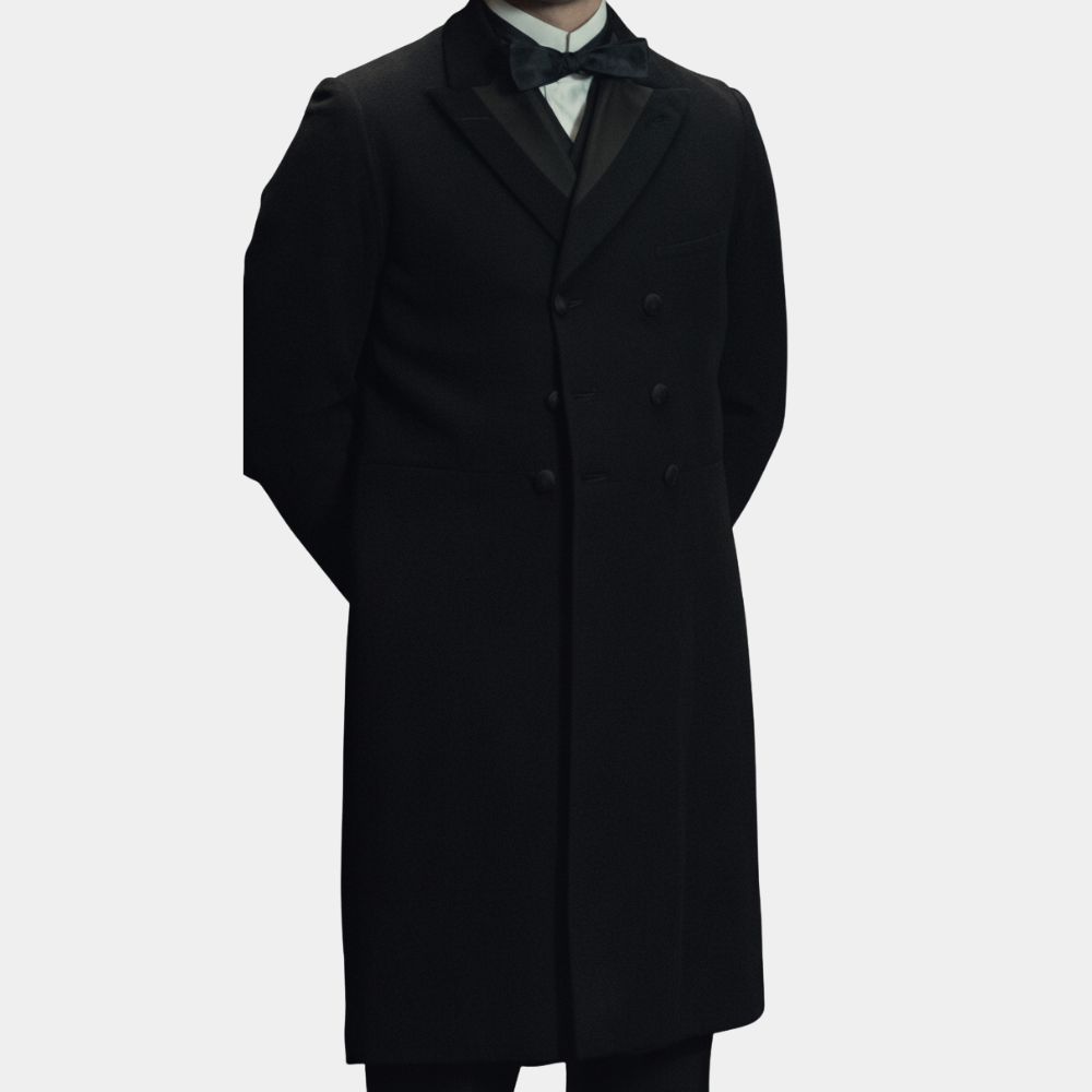 In House of Guinness Louis Partridge as Edward wears a black coat that perfectly reflects the weight of legacy and responsibility his character carries. Edward is caught between family expectations and his own search for identity, and the coat works as a symbol of that tension. It is formal enough to align him with tradition yet understated enough to hint at his individuality. Long black coats have long been used in film and literature to convey authority, mystery, and depth, and here it becomes a natural extension of Edward’s journey through a world built on power and heritage.