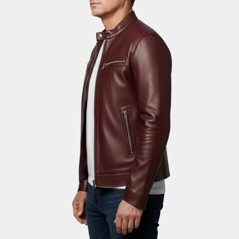 The jacket itself has a smooth finish and a clean front that keeps things simple and bold. The shoulders have a structured feel that adds quiet authority while the neatly placed pockets and metal hardware give it a modern touch without going over the top. Burgundy brings a sense of depth to the design which boosts the whole outfit on camera. Fans can wear this jacket to night events hangouts concerts or anywhere they want to bring Renner style confidence without looking like they tried too hard.
