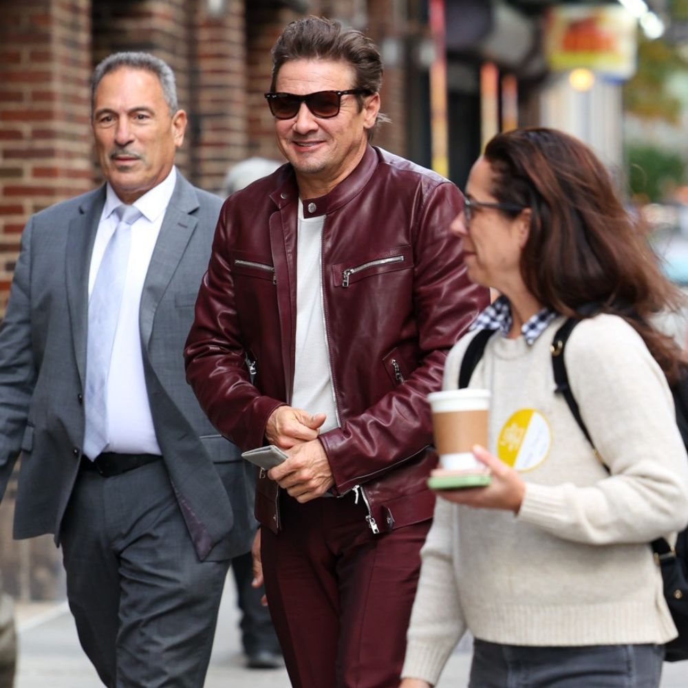 Jeremy Renner stepped onto The Late Show with Stephen Colbert in season eleven wearing a burgundy leather jacket that felt very true to his story and vibe. Renner often blends calm confidence with a grounded strength and this jacket captures that energy. The rich burgundy tone reflects someone who has lived through both tough roles and real world challenges yet still shows up with warmth and sharp presence. It channels the style of classic American leather looks often linked to musicians and action stars which fits Renner perfectly since he always walks the line between easygoing charm and hero energy.