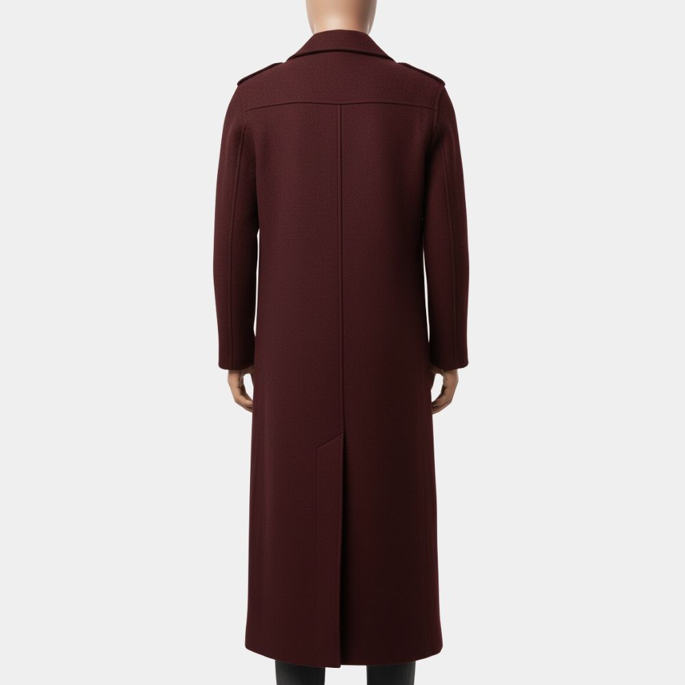 The coat itself is built with classic trench details, from its sharp lapels to its long tailored cut, while the maroon tone adds a striking twist that sets it apart from the usual blacks and grays. Wool gives it structure and warmth, making it as practical as it is stylish, and its clean lines ensure it carries authority without trying too hard.