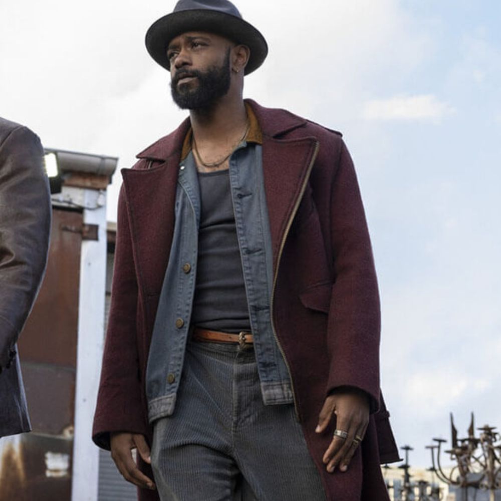 In Play Dirty LaKeith Stanfield as Grofield steps into a maroon wool trench coat that speaks volumes about his character’s presence. Grofield is a man who operates in the middle ground between charm and danger, and the coat captures that duality perfectly. It carries an old world elegance mixed with a modern edge, giving him the look of someone who is always in control of the room. The choice of a trench coat also ties back to the long tradition of crime and noir storytelling, where outerwear often reflects mystery, strategy, and confidence—qualities that fit Grofield’s role seamlessly.