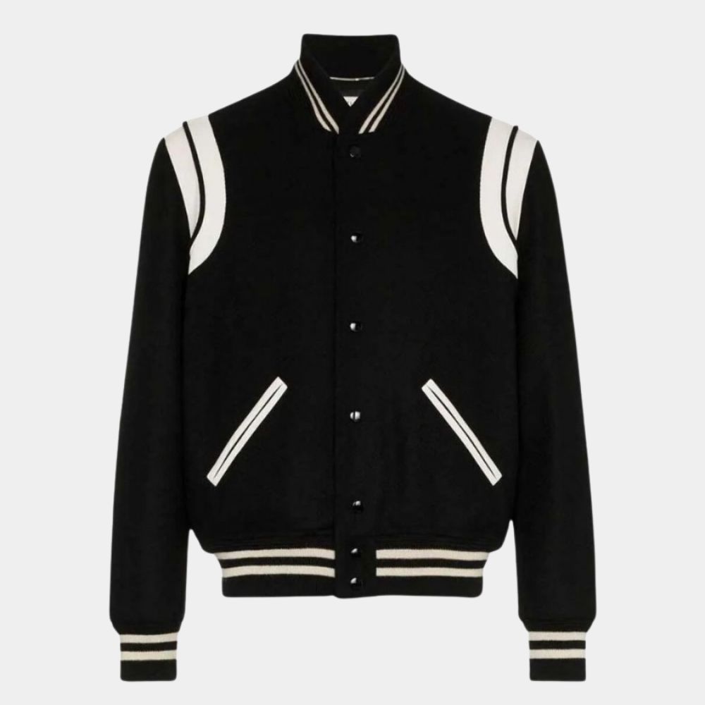 The Saint Laurent SLP Teddy black and white varsity jacket has become one of those pieces that perfectly blends nostalgia with luxury. Inspired by classic American varsity jackets that once symbolized school pride and youthful energy, Saint Laurent took the idea and reimagined it for a modern audience. By keeping the retro roots but elevating the details, the jacket speaks to both heritage and high fashion. It matches the kind of character who balances confidence with effortlessness—someone who wants to nod to tradition while still standing out in a contemporary way.