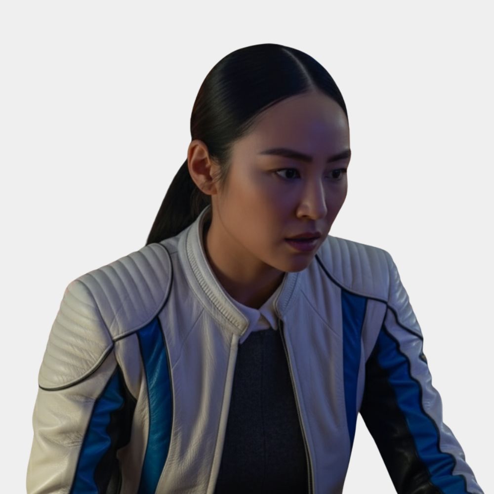 The design itself sticks to the roots of a classic cafe racer jacket but gives it a modern upgrade. With its stand collar and smooth zip front it is built to look fast and functional while the fitted cut keeps it streamlined and minimal. The white leather sets it apart from the usual darker tones of biker jackets making it feel futuristic and refined rather than rebellious. Originating from European motorcycle culture the cafe racer style has always been about speed and precision and here it transforms into something cinematic that feels right at home in a neon drenched sci fi world. Fans could wear this jacket to comic cons themed parties or even as a bold fashion statement in everyday streetwear. It is the kind of piece that captures both the essence of Tron and the cool confidence of Greta Lee’s character.