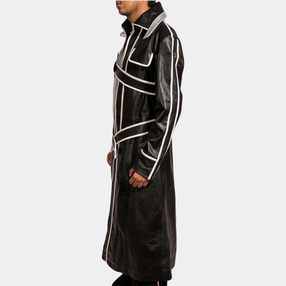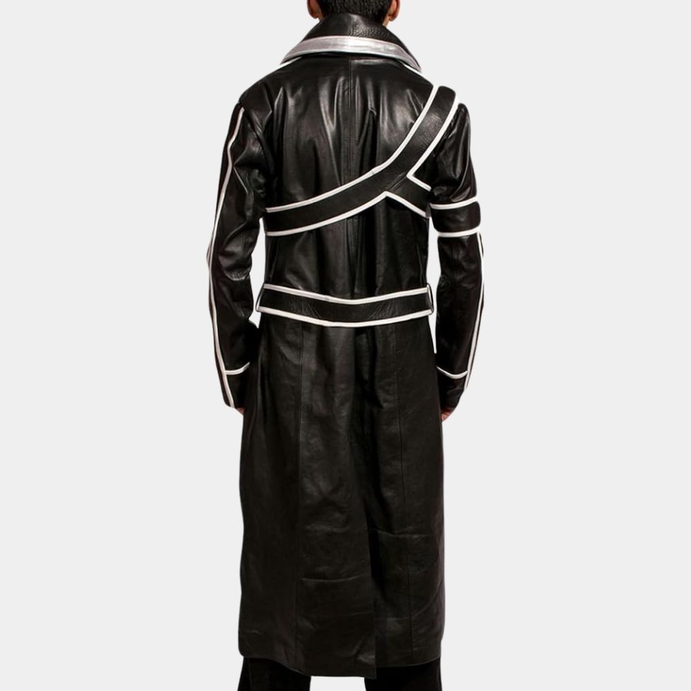 The design builds on a classic fantasy gaming aesthetic, with its long length, fitted cut, and detailed silver trim that outlines the coat’s structure. The leather material adds durability and a sleek edge, while the high collar and strapped accents give it that combat ready vibe. Outfits like this draw inspiration from both anime’s visual storytelling and the long history of fantasy role playing designs, where coats often signal power and individuality. Its significance lies in how it cements Kirito’s image as the Black Swordsman, a title that fans immediately associate with him. For those who want to channel his energy, the coat works perfectly for cosplay, conventions, themed events, or even as a standout piece for fans who love bringing a little anime flair into their everyday look.