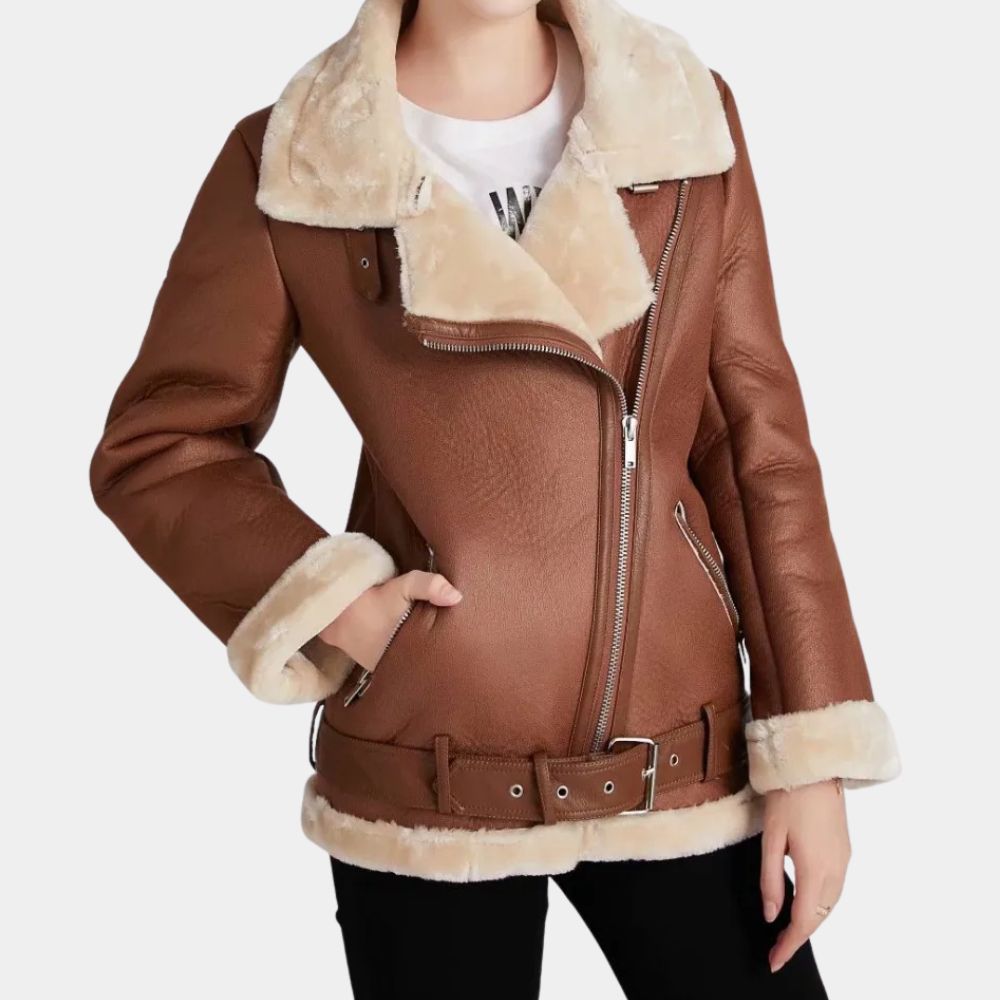 The jacket itself is designed in a warm tan leather that gives it a softer, more approachable feel compared to the classic black biker look. It features zipper details, a fitted cut, and just enough edge to keep it stylish without losing its everyday charm. Rooted in the tradition of leather jackets as a symbol of independence and self expression, this piece is significant because it modernizes the classic style for a younger, fresher vibe. Fans could easily wear this to casual outings, school events, concerts, or just as a daily wardrobe staple when they want to channel Josslyn’s mix of resilience and laid back confidence.