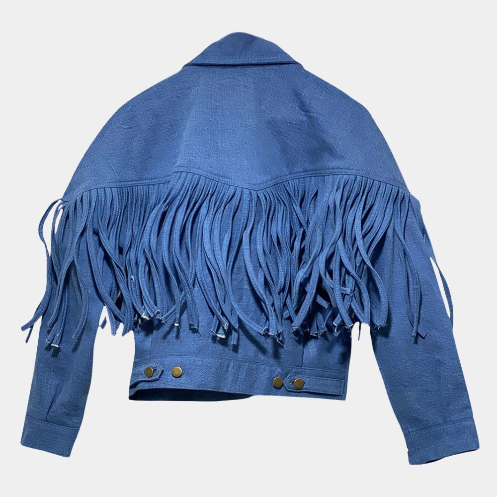 The design leans into classic denim with a tailored cut, button front, and structured shoulders, but the real standout is the fringe detailing that runs across the chest and sleeves. This element gives movement and flair, transforming a timeless workwear fabric into something with energy and attitude. Denim jackets date back to the late 1800s as durable clothing for workers before evolving into cultural staples of rebellion and youth, and here the addition of fringe ties that history to western heritage. For fans, this jacket is perfect for concerts, festivals, nights out, or casual outings where you want to channel a mix of country charm and modern edge.